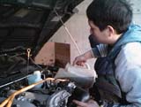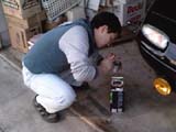 右が新しいオイルをエンジンに注ぎ込んでいる角山さん。