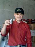 左は外したオイルフィルタで乾杯のポーズをとるじろーさん、